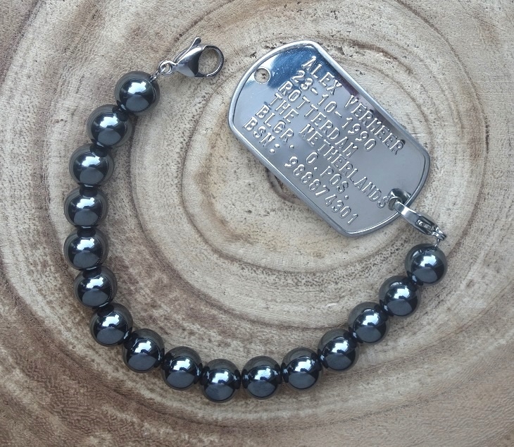 Levertijd dogtag armband RVS met edelsteenkralen op uw maat gemaakt
