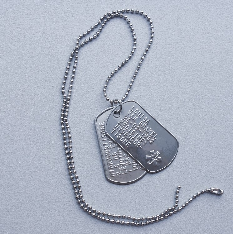 Meditag met al uw belangrijke medische gegevens. De meditag kan uw leven redden; geruststellend voor u en uw familie! U ontvangt een rvs plaatje met medisch teken en een geponst plaatje. Bij weethoeikheet.nl 6 regels tekst mogelijk!